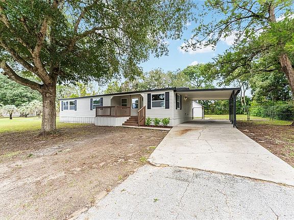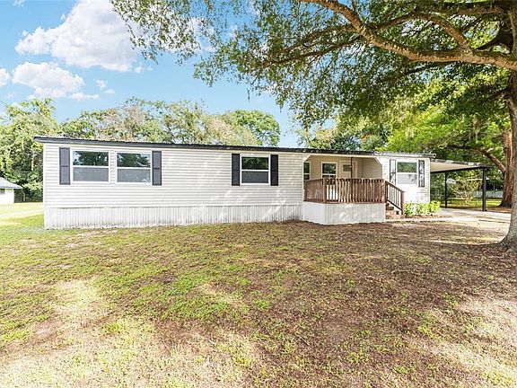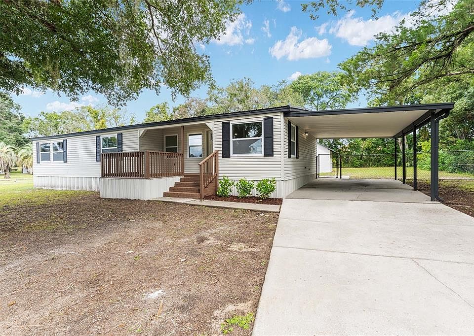 Completely Renovated and Move-In Ready! This beautifully updated doublewide mobile home offers over 1,300 sq ft of comfortable living space with high-end finishes and thoughtful details throughout. Recent upgrades include a newer metal roof and HVAC system, a welcoming front porch deck, and a spacious covered back patio perfect for relaxing or entertaining. Enjoy peace and privacy in the fenced backyard, which features a 395 sq ft built-in storage unit—fully powered with electric and water, offering endless possibilities for a workshop, studio, or hobby space. With a government owned easement behind the property, you’ll appreciate having no immediate rear neighbors. Inside, this home impresses with recessed lighting, luxury vinyl plank flooring throughout, and a bright open-concept floorplan. The island kitchen is a showstopper, featuring quartz countertops, stainless steel appliances, and ample cabinet and counter space for the home chef. The primary suite offers a true retreat with a massive walk-in shower, dual vanities, and an oversized closet for plenty of storage. Additional highlights include an extra-large carport and a prime location conveniently situated between Ocala and The Villages, close to shopping, dining, and medical facilities. This one checks all the boxes—modern style, functionality, and comfort—all in a fantastic central location!