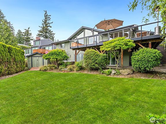 A Mukilteo beauty! Extraordinary, welcoming & spacious 5 bedroom custom home in excellent condition & desirable neighborhood. Open floor plan w/ beamed cathedral ceilings, oak floors, fine moldings, skylights, and walls of windows overlooking the verdant territorial view. Kitchen includes ample slab granite counters & island, travertine floors, high-end stainless steel appliances, desk area, & access to the spacious Ipe wrap around deck. 5 huge bedrooms, incl luxurious primary suite and 2 lower level bedrooms. Rec room & home gym. Private outlook, large fenced yard, hot tub, sauna, & shop w/ power and vacuum in THREE CAR GARAGE! Choice, quiet locale in pretty neighborhood but near stores & DT Mukilteo. Excellent Mukilteo Schools.