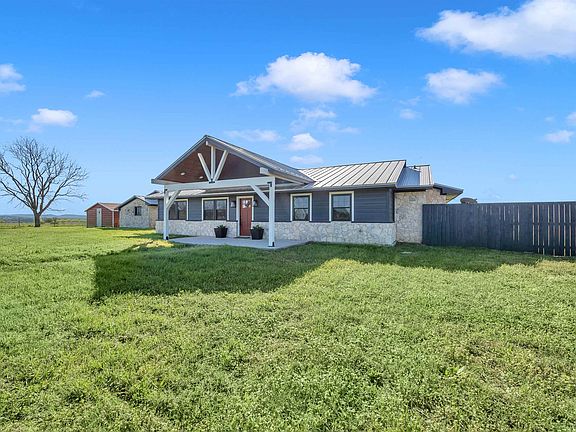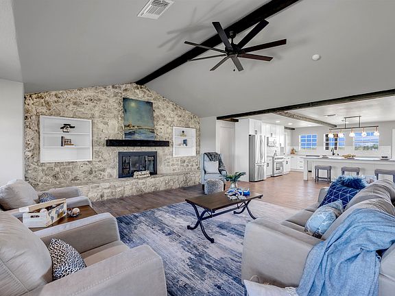 Completely Remodeled Modern Farmhouse home in the beautiful Hill Country of Marble Falls nestled on 2 completely fenced acres with gate. The views are amazing. This 4 bedroom/3 bath home has a touch of country with a splash of elegance. As you enter the front door you are met with expansive wooden rustic beams, elegant wood look tile at your feet and rock against the fireplace wall that ties that home feel all together. The designer has brought in open concept making the flow flawless. There is room for your farmhouse table and bar stool at the enormous Kitchen island, that is adorned with Taj Mahal Leathered Quartz. There is storage at every turn, down to the wine bar, and every cook’s dream of deep pull out drawers. The kitchen is topped off with large farmhouse sink, Pot filler over the range, wine fridge, beautiful lighting and Large Pantry/laundry room to the side and a mud area coming in the side door! The Windows allow the outside to collide with inside living. The Large Master Suite provides privacy down the hall with large walk-in closets and built in office area. Master Bathroom has large walk-in shower, rainwater heads, double sinks, with a vanity area and Taj Mahal leathered granite continued throughout all bathrooms. At the opposite end of the house is another En-suite, and two more bedrooms. 2500 Gallon Well Storage Tank, Large Covered Parking with back entry to house.