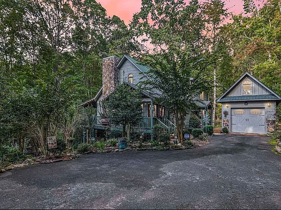 Nestled deep in the mountains of Ellijay, Georgia lies this charming, comfortable, secluded cabin home, complete with 4 beds & 3.5 baths, a modern kitchen, a creekside pavilion, cozy decor, a gorgeous woodland garden with fire pit, & two wraparound porches with peaceful wooded views.