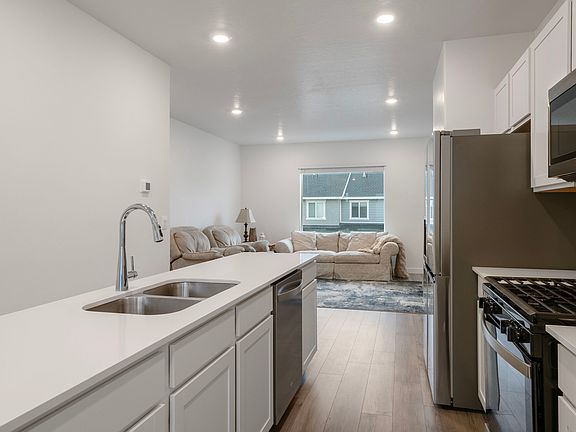 Immaculate townhome located on the Saratoga Springs/Lehi Border, North Shore community for quick access to I-15 or Redwood Road, only 2 years old! This home features Sandbar Park directly out the front door, a main-level bedroom and full bathroom. The main living area includes large windows and a kitchen centered around a spacious island. Upstairs, you will find two additional bedrooms with en-suite bathrooms and large closets. The community offers an array of amenities: pool, clubhouse, pickleball courts, a dog park, multiple parks, and easy access to walking trails. Move-in ready!