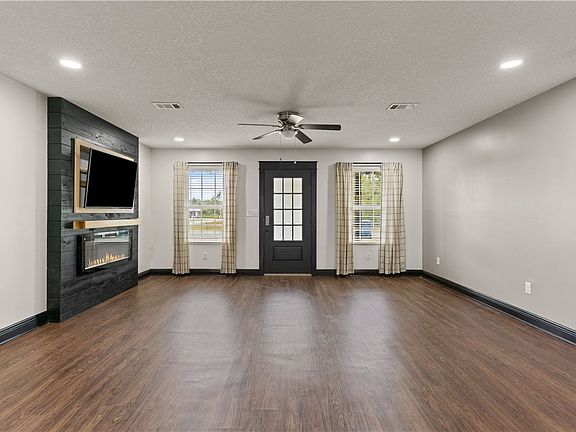 The spacious living room boasts a built-in TV complete with an electric fireplace and a stylish mantle, perfect for cozy evenings. The TV is included with the home, ensuring your entertainment setup is ready from day one.