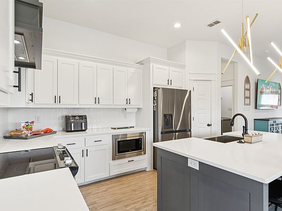Better than new now! Incredibly gorgeous custom built home offers show-stopping curb appeal & custom upgrades that really gives the home that WOW factor! Once inside, you are welcomed by a stylish interior with soft neutral colors, and on-trend flooring that accents any décor. This home is perfect for entertaining, with an open concept layout offering a large family room and spacious breakfast nook right off the expansive magazine worthy kitchen that will certainly be the setting for many future parties and gatherings! Anchored by a large island, and equipped with chef's grade stainless steel appliances, farmhouse sink, captivating fixtures, shaker style cabinetry, designer backsplash, and white quartz countertops! Two refrigerators, washer, and dryer are also negotiable. The thoughtfully designed split layout ensures privacy for the primary retreat, and showcases ensuite with granite countertops, a sleek & modern walk-in shower, and large walk-in closet. This private fully fenced backyard makes entertaining a breeze, offering a covered patio, stone fire pit, and plenty of room to create the ultimate outdoor living space! Upgrades include a fully insulated, climate control attic. No HOA! Amenities include a playground, splash water pad, soccer field, basketball court, and walking trail! 3D Scan available online.