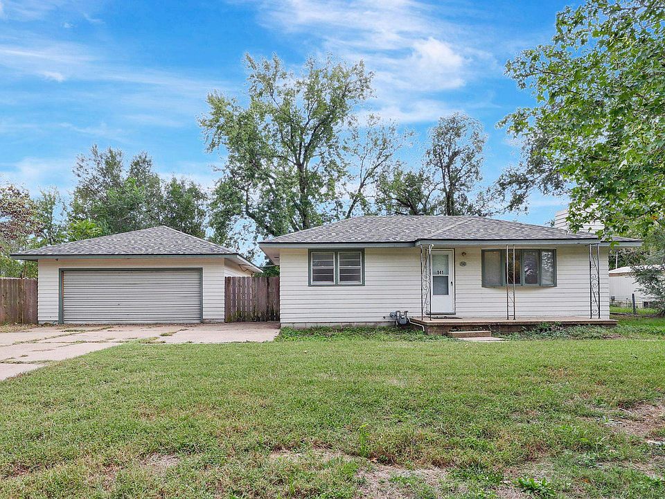 Charming 3-bedroom ranch in southwest Wichita with great potential! This 1,000 sq ft home features a bright living room with large windows and a cozy fireplace, an eat-in kitchen with plenty of cabinet space, and a full bath with tiled shower and updated vanity. Enjoy convenient main-floor living, central heat and air, and a functional layout ready for your personal touch. Outside, the spacious lot includes a detached two-car garage, wide driveway, and fenced backyard—ideal for relaxing or entertaining. Located in Wichita Public Schools (USD 259) and close to shopping, dining, and parks, this home offers comfort, convenience, and value in one affordable package.