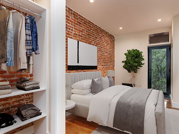 This stunning four-bed, two-bath unit is a beautifully reimagined sanctuary, offering an ideal blend of historic charm and modern luxury. Flooded with light and style, it features elegant herringbone hardwood floors, soaring coffered ceilings, and exposed brick. The layout is thoughtfully designed with a sprawling living room, and sleek finishes throughout, including a brand-new in-unit washer and dryer, oversized farmhouse sink, stainless steel appliances, wine fridge, microwave, and dishwasher. The kitchen stuns with extended marble countertops and backsplash, abundant cabinet space, and a layout perfect for entertaining. Each of the four bedrooms includes large built-in closets, while the bathrooms boast spa-level finishes with wall-hung toilets, deep soaking tub, and a luxurious glass-enclosed shower.