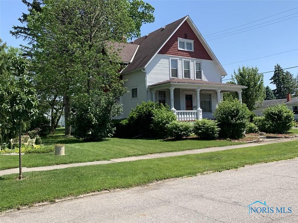 Beautiful two story home on a corner lot with detached one car garage. You will appreciate all the old woodwork throughout the home along with the natural brick divider in the remodeled kitchen. All appliances stay including the year old stove and refrigerator. The dining room and kitchen are open to each other and have easy to clean ceramic tiled floors. There's a half bath on the main floor and a full bath upstairs with the four bedrooms. The spacious front porch will make you want to go out and grab some fresh air. There's also a patio area out back with a beautiful red bud tree for shade.