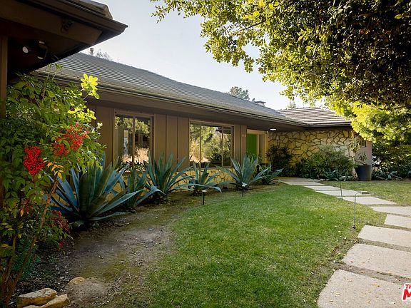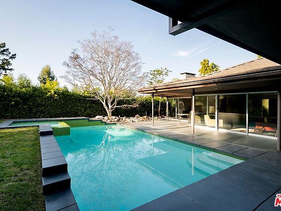 Meticulously renovated mid century modern gem privately tucked away on a quiet cul-de-sac in Beverly Hills. Upon entering the double entry doors, guests are immediately welcomed by stunning views of the backyard courtesy of the wall-to-wall glass sliding doors across the formal living room. Polished concrete floors, vaulted ceilings, and a wood feature wall with a stone fireplace harmoniously create this inviting yet sophisticated living space. A just-as-impressive stone fireplace that pays homage to original mid century design is showcased in the den alongside built-in's and wood accordion doors to privatize from the living room. A bright and airy formal dining room thoughtfully leads into the chef's kitchen for smooth entertainment. The fully-equipped kitchen offers stainless steel appliances, a center island, and an abundance of cabinetry for storage. On the wing of the house is the luxurious primary suite that boasts custom closets, a built-in floating desk, and en suite with dual sinks, soaker tub, and a free standing shower. Two additional bedrooms, each generous in size with en suites, and a laundry room complete this highly functional floor plan. Seamless indoor-outdoor living ensures enjoyment of all of this 17,000+ SqFt lot that is framed by lush greenery and mature landscaping. An immense pool and spa border a grassy pad and fruit trees to complete this outdoor oasis. Don't miss this turn-key house in one of the most coveted locations.