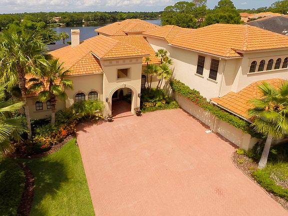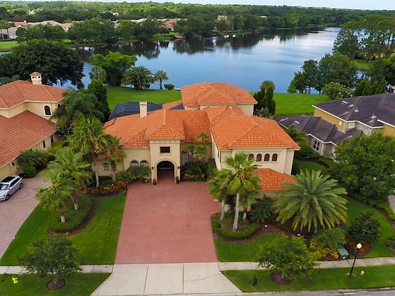 Stunning "Hannah Bartoletta" Mediterranean Lakefront Pool home with tile barrel roof on over half-an-acre premium homesite in Tree Tops showcasing a versatile floorplan over 6000sqft with 5 bedrooms, 5 full bathrooms, powder room, Office/Study, Bonus and Outdoor Kitchen. The moment you step through the grand foyer you will begin to appreciate this well maintained home with hardwood flooring, crown molding, arches, columns, niches, fireplace, French doors, 12ft ceilings and more. A Chef's delight awaits in the gourmet kitchen offering 42" Brookhaven raised panel cabinetry, granite counters, stainless steel appliances, brushed chrome hardware, icemaker, breakfast bar and island. Opening to the large family room the kitchen offers stunning lake and pool views with plenty of natural light. Downstairs you will find a sumptuous Master-Suite with hardwood flooring, plantation shutters, French doors directly to pool and patio, a large master bathroom with granite counters, garden tub, two-way walk through shower with double shower heads, wooden beam detail and a fabulous walk-in closet 17ftx10ft with built-in closet system. There are three secondary bedrooms also on the first floor and three full baths. Upstairs overlooking the lake is a bonus room, separate office, storage, half bath (pre-plumbed for full bath option) and balcony (21ftx11ft) to appreciate the stunning sunsets ! Above the garage is the fifth bedroom or studio measuring 33ft x 24ft with full bath and storage. See Virtual Tour Links.
