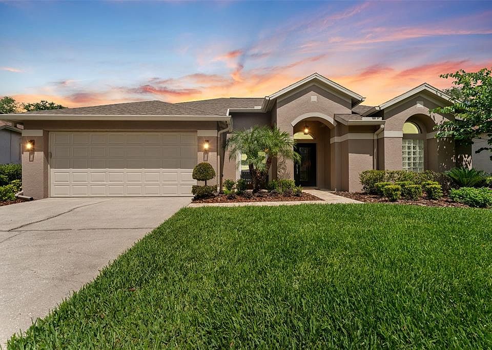 Welcome to your dream home nestled in the heart of New Tampa! Located in the sought-after 24/7 manned gated community of Hunters Green, this spacious and beautifully upgraded 4-bedroom, 3-bathroom home with a dedicated study/den offers 2,212 square feet of elegant living space. Perfect for those seeking comfort, convenience, and resort-style amenities. Step inside and be greeted by plantation shutters, remote-controlled roll-down blinds, and a warm electronic fireplace that creates an inviting ambiance throughout the open-concept living and dining areas. The private study/den provides the perfect space for working from home or reading. You will also discover a 2022 Samsung stainless steel appliance package in the gourmet kitchen, newer Pergo waterproof laminate flooring (2022) throughout the main living areas and bedrooms, and fresh interior and exterior paint (2023). The spacious primary suite features custom closets for optimal organization and style, while all bathrooms were fully renovated in 2023 with modern finishes and fixtures. The primary bathroom features dual sinks, a remodeled step in shower and a free standing soaking tub! The roof was replaced in 2017 and the AC was replaced in 2023! Enjoy the Florida lifestyle year-round on your large screened-in paver patio, ideal for relaxing or entertaining. Hunter Green has so much to offer its residents including designated bike lanes, playgrounds, lighted tennis, basketball, volleyball, soccer and baseball facilities, jogging trail with a 15-station exercise circuit and an off-leash dog park. Also located on property, separate membership at Hunter’s Green Country Club can include golfing on the 18-Hole Tom Fazio designed course or privileges at their Tennis and Athletic Center. Situated just minutes from top-rated schools, premium shopping, dining, Flatwoods Nature Park and I-75, this exceptional property offers the best of New Tampa.