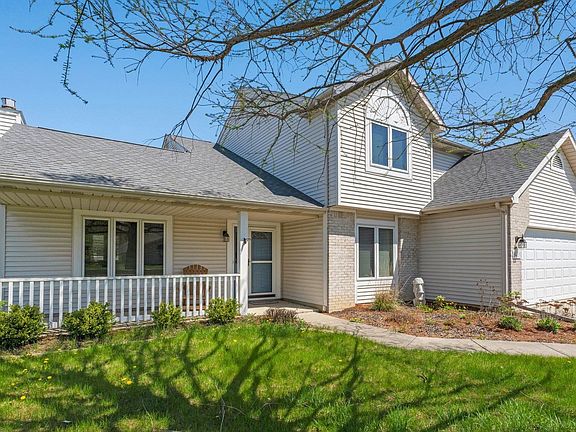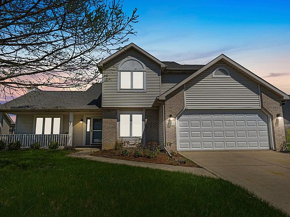 Step into this charming open-concept home, complete with a welcoming covered porch. The fenced backyard is an added bonus, perfect for privacy and outdoor activities. The recent expanded and landscaped patio offers a quiet retreat including a recently installed hot tub. New Outdoor speakers and sound system completes this oasis. Inside, the spacious living room features a gas fireplace beneath a soaring cathedral ceiling, with high-quality wood laminate flooring extending throughout the main level. A versatile dining area, conveniently located next to the foyer, can also serve as an office or den. The kitchen, open to the cozy nook, provides easy access to the backyard patio, offering plenty of counter space and a built-in desk for added functionality. The patio door is new in 2021. The interior trim and kitchen cabinets boast a light stain, giving the home a modern, fresh look. New appliances in 2021 complete this culinary retreat. Upstairs, you'll find the bedrooms, including a master suite with a generous walk-in closet and a roomy shower in the en-suite bath. An additional full bathroom is also located on the upper level, while a convenient half-bath serves the main floor. The main level also features a laundry room for added convenience. Additional highlights include pull-down attic storage in the garage, a roof replacement in 2019, and a new furnace and air conditioner in 2018. The garage door opener was also updated in 2019. Most of the home received a fresh coat of paint in 2025 and new carpeting in 2023. This home offers both comfort and style—make it yours today!