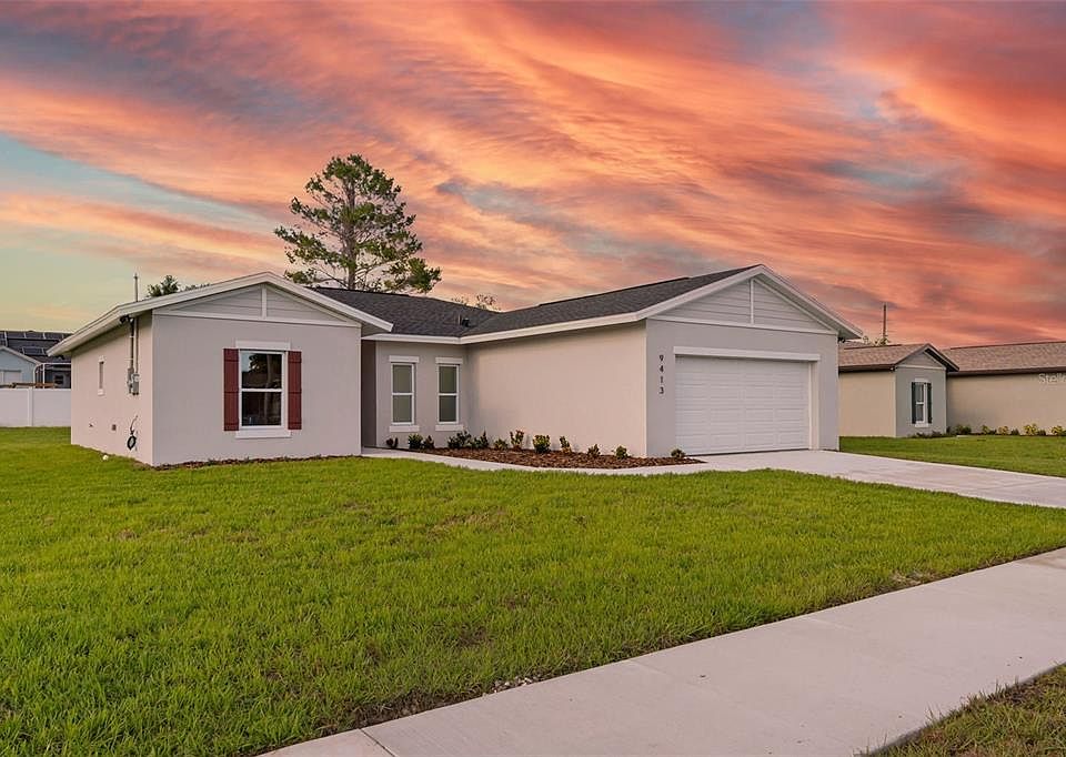 COMPLETED, MOVE IN READY HOME! Be in awe from the moment you pull up! This beautiful, brand new 2023 build awaits you! This unique home has GORGEOUS updated features from the matte black faucet and handlers to the spectacular lighting! Be impressed walking inside to towering 9 foot ceilings, luxury vinyl floors & an open floor plan. Off the entryway is an office or den, which could easily be transformed into a 4th bedroom, gym or game room! The kitchen features 2 tone- white & light grey soft-close kitchen cabinets, white granite countertops, Samsung stainless steel appliances, a pantry & indoor laundry with storage. Inside the kitchen find a hideaway trash can & by the stove is a pull out spice rack! The living / dining space sits off the open kitchen, perfect for entertaining! The owners retreat is tucked away in the back of the home, for ideal privacy. This space boasts of beauty with recessed lighting, double closets - with gorgeous modern bathroom vanity & oversized shower. Both spare bedrooms have great space & beautiful closets & the second bathroom has a shower / tub combo! The garage comes ready for you to pull your toys in, with garage door opener, remotes & a polished & sealed floor. All windows & sliding doors are impact resistant! This home will not last long, so call today to schedule your private tour!