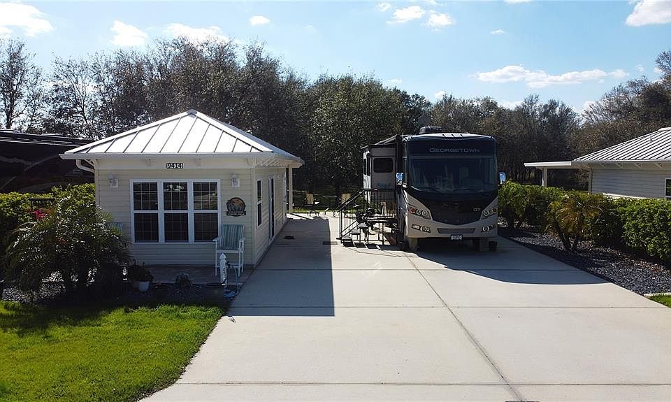 Welcome to Lot 64 in Florida Grande, a stunning 5,000 sq. ft. property offering the perfect blend of space, privacy, and resort-style living. Designed to accommodate the largest motorhomes, this back-in, east-facing lot features a 26' x 76' concrete pad with 50-amp electric, water, and sewer, along with ample space for cars, golf carts, and more. Ten picturesque palm trees surround the property, creating the quintessential Florida retreat, while full, thick boundary hedges define the space for added privacy. What truly sets this property apart is its unparalleled setting—backing up to the resort’s nature preserve, an area that will never be built on. This ensures breathtaking, uninterrupted views and stunning sunsets behind the trees, making for the perfect Florida evenings. Enjoy the serene outdoor living space under the covered pergola, complete with outdoor furniture and a propane fire pit, both of which convey with the property. The 384 sq. ft. Grande Suite, a newer build just a few years old, offers a stylish and comfortable retreat. Inside, luxury vinyl plank flooring runs throughout, complemented by a mini-split heating and air system for year-round comfort. The fully furnished living area includes a sleeper sofa, electric theater seats, TV, fireplace, and dining table with chairs. The kitchenette features sought-after two-tone cabinetry, a beverage refrigerator, and a microwave. The full bath boasts a walk-in shower, and the laundry/storage room includes a stacked washer and dryer for added convenience. Outside, pavers extend around the front and back side of the Grande Suite, and a water softener services both the Suite and the motorhome pedestal. Beyond this incredible lot, Florida Grande offers top-tier amenities, including a brand-new eight court pickleball complex, resort-style pool and spa, dog park, and a 20,000 sq. ft. clubhouse with a fitness center, library, billiards room, craft room, and the impressive Grande Room, where social events and activities are held throughout the season. Located in the heart of Central Florida, Florida Grande is just an hour from Tampa, Orlando, and Ocala, offering the perfect balance of peaceful, unrushed living with easy access to major attractions. At under $200,000, this is a rare opportunity to own a spacious lot with unbeatable nature views in a fantastic motorcoach resort where neighbors quickly become friends. Don't miss your chance—schedule your showing today!