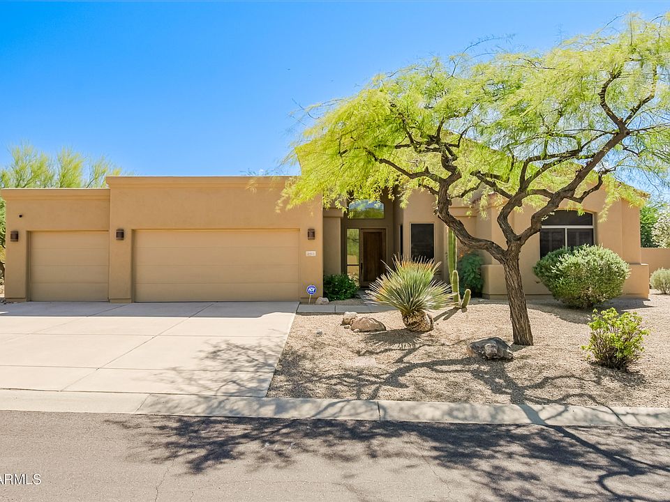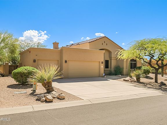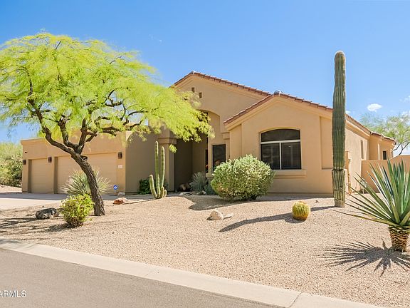 This beautifully maintained 3 bedroom, 2 bath home with a 3 car garage shows spectacular views of Pinnacle Peak and surrounding desert landscape. Recently installed two new Lift Master myQ Garage Doors and updated ADT Security System. Included in this sale is the furniture/furnishings. So many thoughtful upgrades throughout, plantation shutters throughout home, a new roof (2023), new water softener, new kitchen appliances with a beverage refrigerator, and fresh exterior paint. The kitchen, bathrooms, and laundry room have been tastefully updated. You'll find a full list of improvements available in the documents tab. A wonderful turnkey opportunity to enjoy the Troon lifestyle in one of Scottsdale's most sought-after settings. Welcome home!