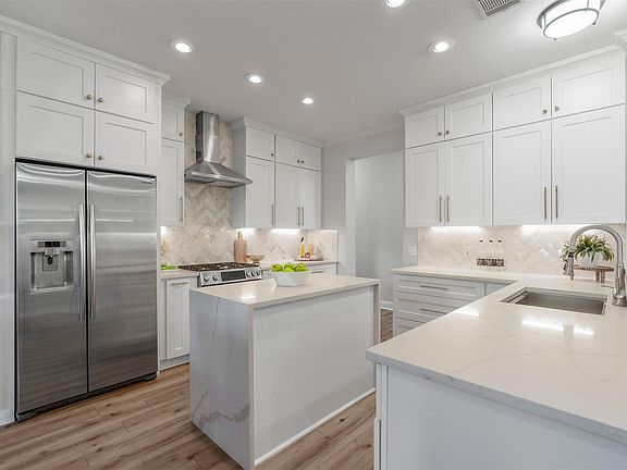 Stainless appliancesQuartz countersUnder-cabinet lightingHerringbone backsplash