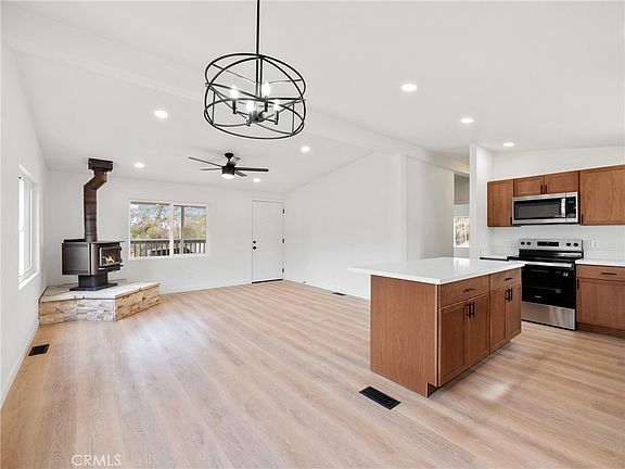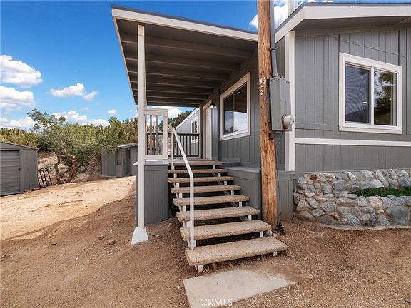 Southside Pinon Hills Manufactured Home that has been pristinely remodeled and ready to call home! The home has been renovated from top to bottom with new roof, new front covered patio and rear deck, new windows, new exterior and interior paint, new drywall, new water resistant laminate wood flooring throughout and carpet in the bedrooms, new fireplace hearth, new cabinets throughout and quartz counters, and new recessed lighting in kitchen and living room, as well as new electrical, and plumbing fixtures throughout. The kitchen offers spacious counter space with a 6 foot island with breakfast counter and new stainless steel range/oven, dishwasher, and overhead microwave. Living room is open with beautiful views and a perfect wood burning fireplace in the corner for the winter months. Down the hallway is the primary bedroom and bath with a walk in closet as well as bedroom 2 which both include ceiling fans. Both bathrooms are all new with white shaker vanities, new fixtures, tub enclosures and toilets. Laundry hookups for washer and dryer are located in the hallway. This home is all electric which takes away the added expense of bottled propane in the winter months. Home also offers a brand new central air conditioner and furnace. Out back you step onto the new redwood deck and enjoy the privacy of the fenced backyard and views of the San Gabriel Mountains that are just south of you. The home is located on a private driveway and offers privacy from your neighbors that is difficult to find. The property has a newer storage shed, a covered carport, a 1 car garage, and a chicken coop that have all been painted to match the home. Buyer to satisfy themselves on whether the outbuildings have been permitted. This property is zoned for horses, located in Snow Line School District, and offers easy access to Hwy 138 for commuting.