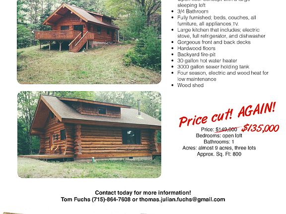 Quaint hand built Swedish scribed log cabin nestled on almost 9 acres (3 lots) of nicely wooded land with great trails for snow shoeing and skiing and located in the heart of recreational NW WI. It's located 1000 feet from Spring Lake, 5 minutes from Hayward. Fully furnished open floor concept includes large sleeping loft complete with two queen beds, one double bed and the living room has a futon that sleeps two. This is a turn key cabin complete with all furniture, beds, couches, tv, right down to the fully equipped kitchen complete with dishwasher and microwave. We've also included a snow blower, chain saw and four sets of cross country ski's, and the wood shed with 3 cords of wood. Great potential as rental. Lovely stone fire pit. 12' x 25' large back deck and lovely front deck made of maintenance free composite decking. Four season, electric and wood heat for low maintenance. 30 gallon hot water heater.