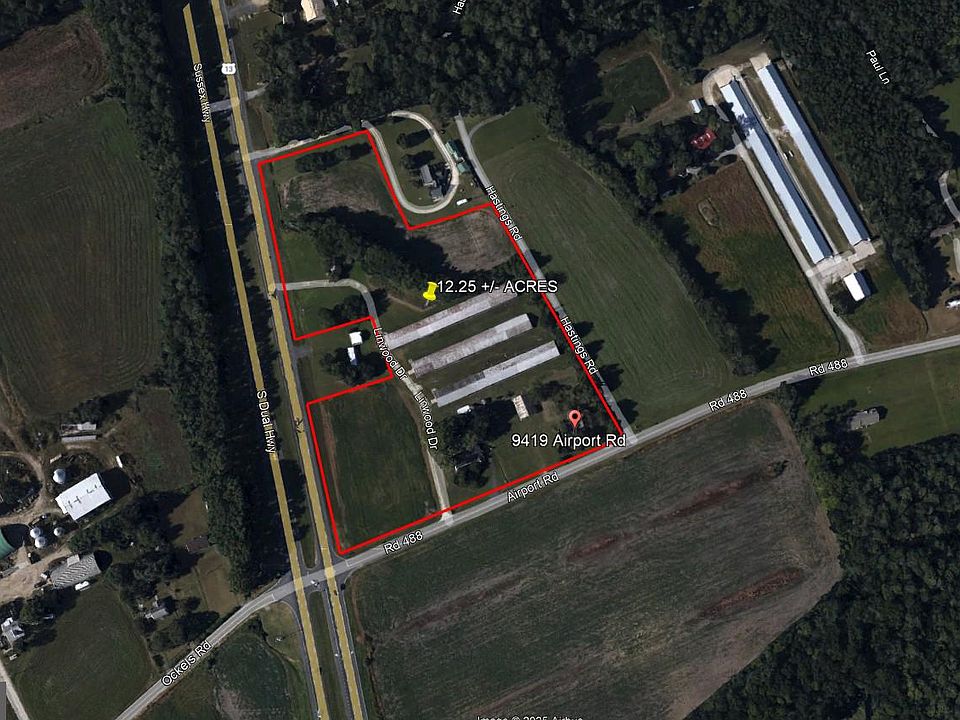 For sale 6 parcels 132-07.00-45.07, 45.05, 45.03, 45.02, 45.00 & 45.00-5627 Total of 12.25 +/- Acres. 9419 i& 9393 Airport Rd have homes on them. 9419 is inhabitable has mound system, private water source, no cooling. 9393 has 2 -garages and multiple outbuildings, gravity fed septic, private well, water heater electric, baseboard heat, air window units, wood burning fireplace & read the disclosures for list of included items. Has billboard on property.