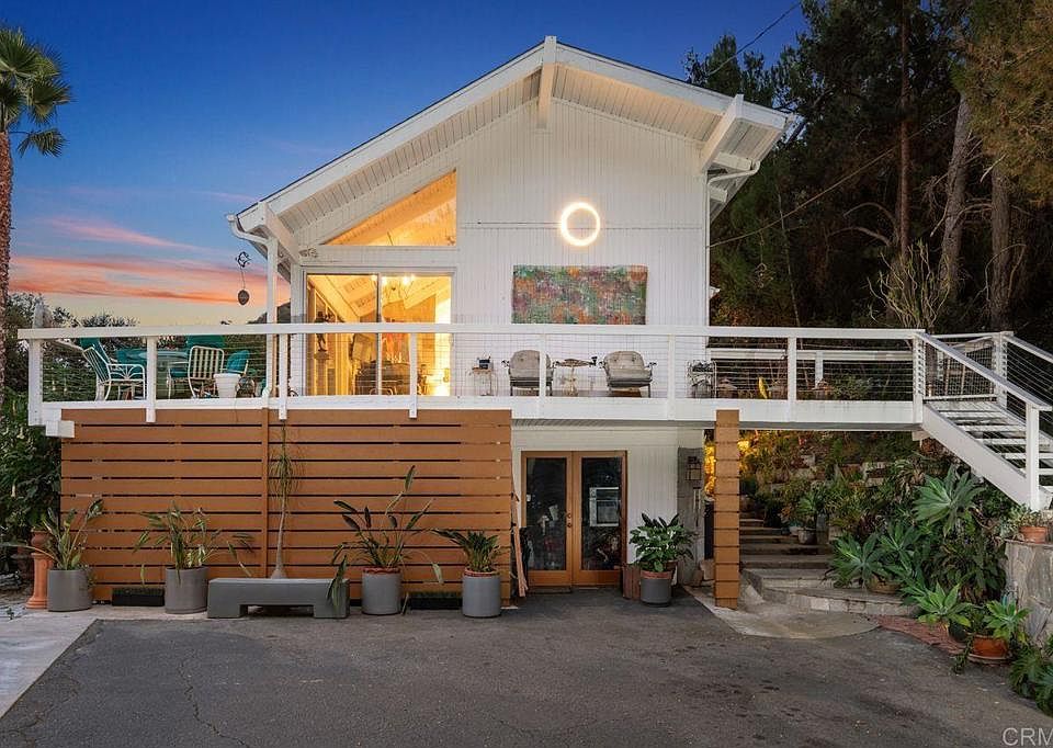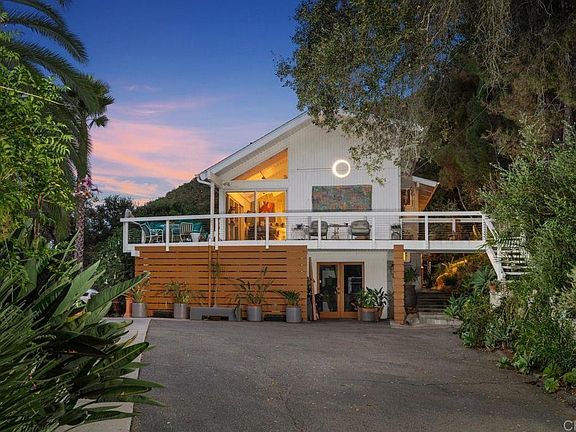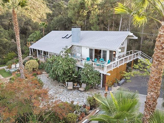 Extremely private with open space on 2 sides featuring seasonal creek, loads of trees (flowering, scented, fruit, native). Updated, freshly painted, operable skylights, track lighting, recessed lighting, contemporary design. Could be a 4 bedroom, Detached office with separate gated drive. Stone walls, Lake Hodges views coupled with layered mountain views. 2 stunning fireplaces with raised hearths. Cable railings. Located off a private lane. Private hiking trails on property. Unique and special. Custom in almost every way. 2nd showings during evening encouraged. Galleria walkway on top floor looking down upon the kitchen and living/dining rooms. Close to Lake Hodges and trail system.