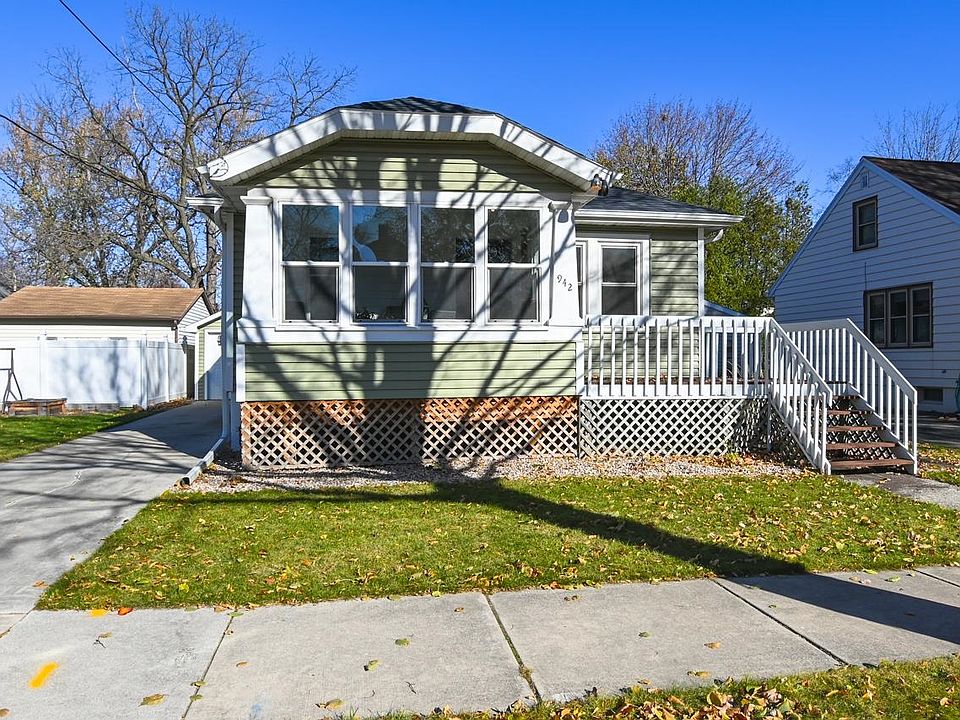 Charm & character galore greet you as you step into enclosed front porch with windows to enjoy 3 seasons. Walk into a cozy LR with orig wood pillars/built in shelves and wide trim, which continues through the dining room complete w/window seat, hw floors in most rooms. A full bath & good sized bedroom w/ lg closet is accessed through the DR. Meander into a nicely updated eat-in kitch w/maple cabinets, updated faucet & spacious dinette w/sliding door leading to backyard patio w/ pergola & beautifully landscaped yard. Off the dinette, there is a back hall/entrance to garage w/ a full bath with w/i shower & knotty pine walls & ceiling. In the lower level is a fin area w/ 2 nice sized closets & the potential for additional finished space. Home offers newer roof, siding, Leaf Fitter gutters.