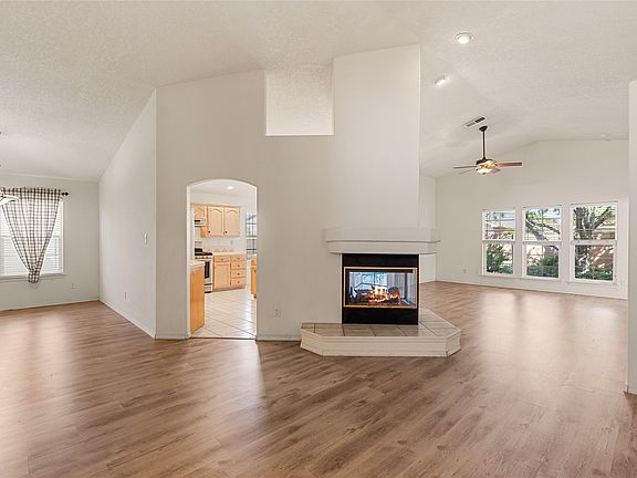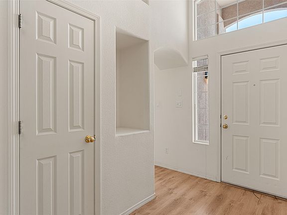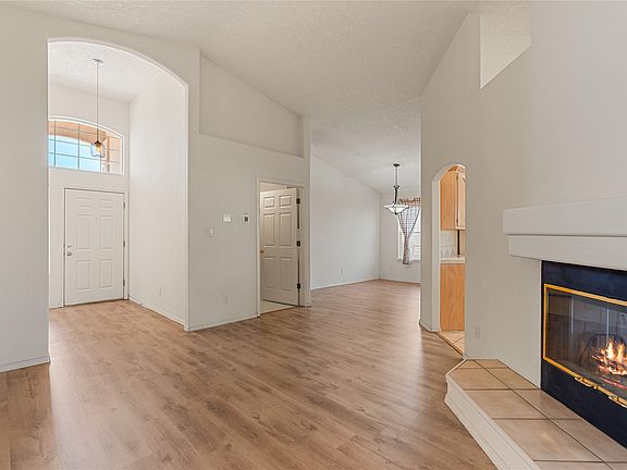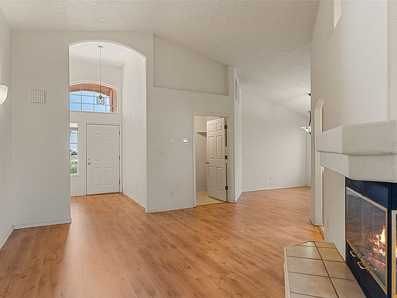 Terrific location for this well designed home situated at the end of a cul da sac. Entry invites you into this beautiful home with high vaulted ceilings. Open yet defined floor plan, two living areas or use one for a formal dining room. Fabulous kitchen with lots of cabinets, and countertop. Breakfast bar and dining area. Great room with three way fireplace, private owner suite with large bathroom with shower and tub. Access to the wonderful backyard from owner suite and the great room. Two other bedrooms with hall bath at separate side of home. Laundry room with sink. Access to the two car garage with storage. Solar is owned. Walled backyard is a true haven w/ several patio areas, a gardener would appreciate landscaping, and a peak of the Sandia Mountains. A wonderful property to entertain both inside and out. A great place to call home!