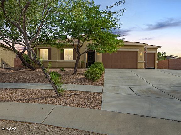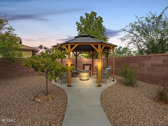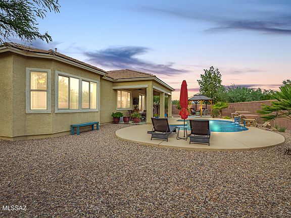 Nestled in Sycamore Canyon within the highly rated Vail School District, this refined Richmond American home pairs thoughtful design with exceptional outdoor living. A 3-car garage with epoxy flooring sets the tone for a residence defined by quality and care. Inside, 10-foot ceilings and seamless tile flooring unify an open, light-filled plan anchored by a chef's kitchen: double ovens, an expanded gas range, a large prep island with seating, granite surfaces, a tile backsplash, and both recessed and pendant lighting. Reverse-osmosis water is integrated into the refrigerator, and comfort is supported by central air with three separate zones and a whole-home water softener. Spacious main bedroom with a bay window, dual-sink ensuite, and a walk-in closet. A Den/Office with double doors offers ideal flexibility for an office or media space. Two additional bedrooms and baths complete a balanced 3-bed/3-bath layout. Mountain views provide a natural backdrop! Outdoors, resort living takes center stage. A PebbleTec pool with water features sits alongside a shaded gazebo and covered patio, framed by low-care landscaping on irrigation. Thoughtful additions, garden beds with dedicated irrigation and fruit trees (peach, lime, lemon) create a lush yet easy-to-maintain setting for everyday enjoyment and effortless entertaining. Residents also enjoy miles of neighborhood trails, a community pool and park.