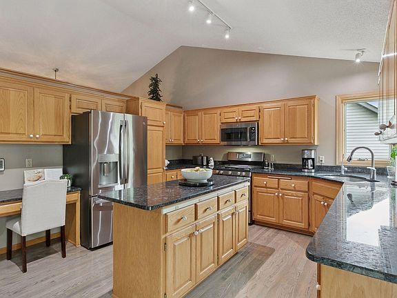 This appealing home is tucked away on a serene and private lot, featuring a fenced backyard, decorative paver patios, newer maintenance-free decking, lush landscaping, and mature trees! Enjoy direct access to Teal Lake Linear Park trail right from your backdoor, with a city park nearby. Inside, discover gracious vaulted ceilings, stunning hardwood floors, and ample space throughout. The kitchen boasts granite countertops, a large center island, and a handy work desk. The living room highlights a cozy gas fireplace and a wall-of-windows bringing in natural light. A main-level bedroom doubles perfectly as a private home office. The sprawling finished lower-level walkout offers endless possibilities with a family room, recreational space, bedroom, bathroom, and storage/hobby/flex room, plus extra storage, and a 2nd laundry space. 3 car garage with an epoxied floor to be completed prior to closing ~ other updates include a new roof and water heater.
