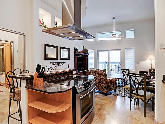 This is a beautiful two bedroom penthouse condo overlooking Galveston Ocean. Entering the home you will notice the high ceilings and large open floor plan thats great for entertaining. The home features luxurious travertine flooring thought out. The kitchen has custom cabinets, granite counter tops, and stainless steel appliances including a Maytag 5 burner range. The master and spare bedroom are spacious with plenty of room. Both bathrooms in the property also feature granite countertops. The complex has a private pool and a fitness room on site and there are two assigned parking spaces in the gated parking garage that come with the unit. Don't miss your chance to call this amazing penthouse condo your next home or vacation home.
