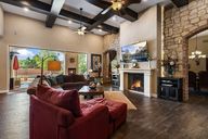 Gas fireplaceDining spacePrep islandWall of retractable doorsHot tubStone archwaysSpa-like bath