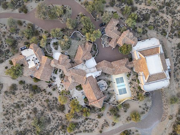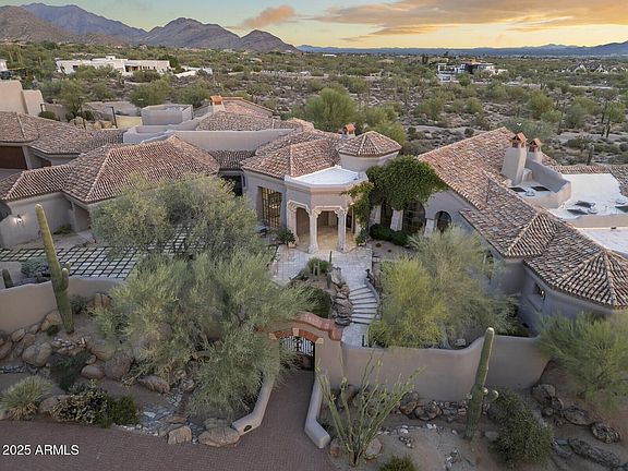 Privately gated at the base of Pinnacle Peak, this nearly seven-acre estate offers sweeping city-light and mountain views with unmatched privacy. A long, estate-style drive leads to a motor court surrounded by sunsets and open desert scenery. The 9,845 sq ft main residence is accompanied by two fully self-contained guest homes of approximately 900 sq ft each, complete with their own garages. At the center of the property is a 7,600 sq ft indoor pavilion—originally a championship tennis facility and later transformed into a luxury auto showroom with capacity for 50 cars. Today, it functions as a premier recreation hall with two indoor pickleball courts, joined by an additional outdoor court and a private indoor swimming pool. Constructed by Kitchell Custom Homes with commercial-grade materials, the estate is designed for both scale and livability. Expansive covered patios, wood-burning fireplaces, and a full outdoor kitchen create seamless indoor-outdoor spaces, while a 7-car garage attached to the main residence offers everyday convenience. This property is a rare opportunity to own one of Scottsdale's most versatile legacy estates.