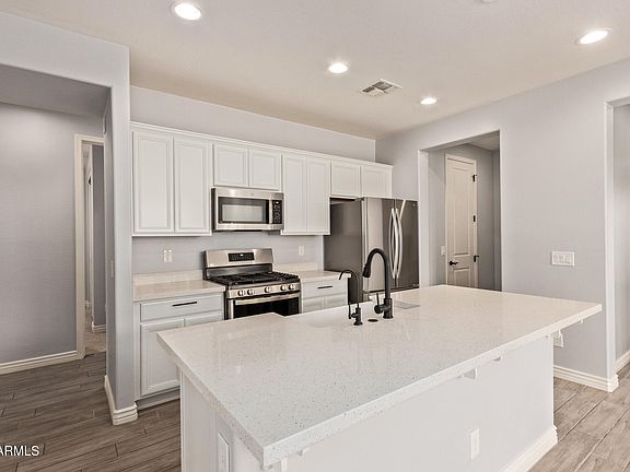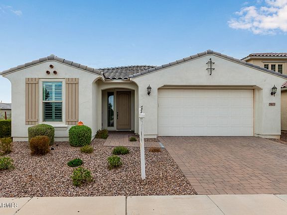 Beautifully upgraded 4 bedrooms with a den, 3 full bathroom home in the sought-after Eastmark community! Bright, open layout filled with natural light, tile floors, shutters, Gourmet kitchen boasts 42'' white cabinets, quartz counters, stainless appliances, large pantry and R/O system. Spacious laundry room. Large primary room w/ large bathroom with separate tub and shower. Retreat to the backyard with its extended patio and grassy area—ideal for relaxing or entertaining. Paver driveway, Epoxy garage floors and water softener and exterior lights. Enjoy all Eastmark offers with parks, pools, events, and a vibrant community lifestyle!