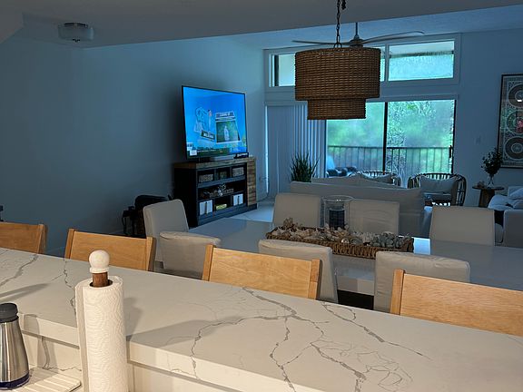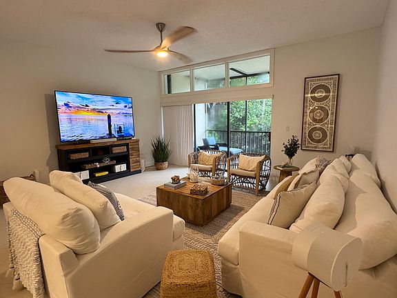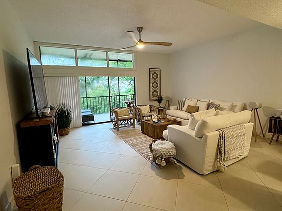 Triple sliders open to a lovely screened patio overlooking lush tropical landscaping, offering seamless indoor-outdoor living.