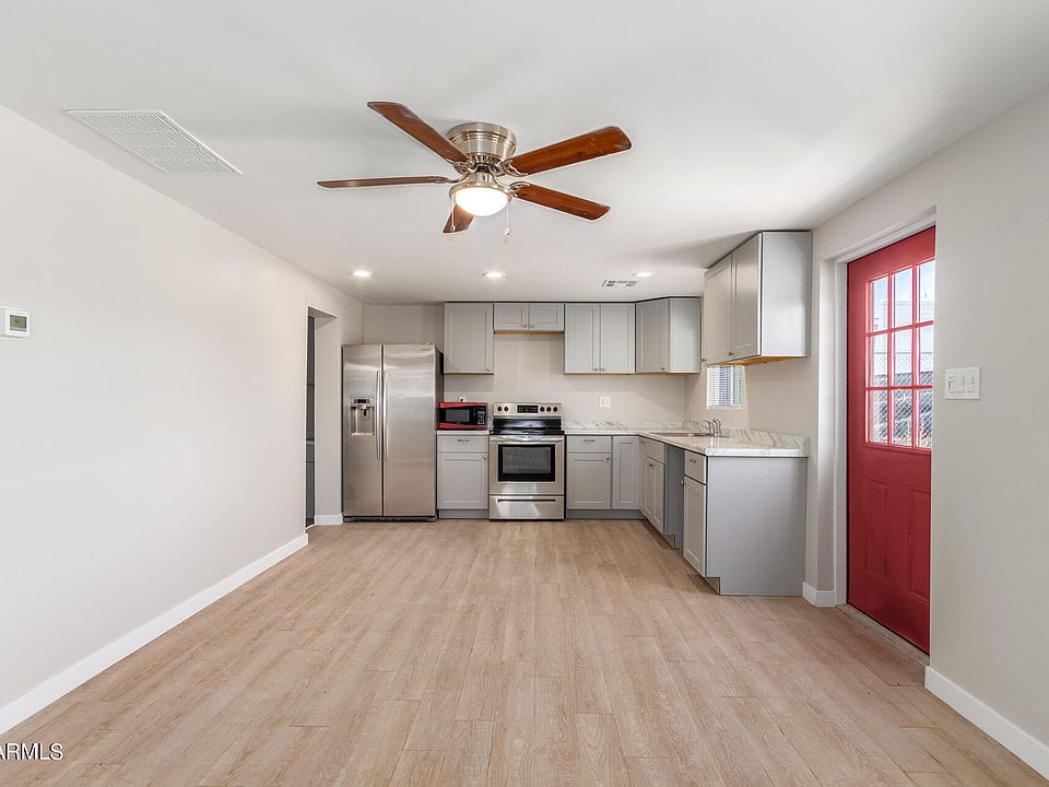 Charming 2 bedroom property conveniently located near restaurants, parks, & schools! Fully fenced yard for privacy, large lot &plenty of space for your RVs, boats, atvs & more. NO HOA. Inside has recessed lighting, kitchen features wood cabinetry & Stainless Steel appliances. Barn doors open to bedroom. The bathroom has a shower/tub combo & double sinks. Outside enjoy the lovely mountain views. This home is great for a first buy property, rental, grandmother suite, plus more & has great potential for upgrading an addition or more. Any additional changes on home can be accommodated by seller and tile has already been purchased located at the back of the lot if buyer wants it installed. LEASE TO OWN OPTION!!