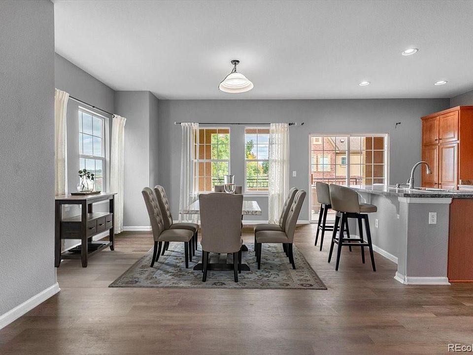 The light-filled gourmet eat-in kitchen features a center island, gleaming LVP floors, and all appliances included. Soaring 12-foot vaulted ceilings and abundant windows invite natural light into every room, complimented by custom blinds and stylish, upgraded light fixtures. Relax by the cozy fireplace or entertain on either of your outdoor living spaces, including a private balcony overlooking lush park views. Your spacious primary suite offers a large walk-in closet with double-vanity sinks. The attached 2-car garage, playroom and additional ground-level storage provide maximum convenience. Property sold as is. This vibrant location puts you steps away from Highlands Ranch’s lively Town Center featuring over 20 shops, restaurants like Old Blinking Light and Landsdowne Arms, Starbucks, farmers markets, and seasonal festivals. The HOA covers access to world-class recreation centers, fitness facilities, snow removal, and exterior maintenance – so you can focus on living, not upkeep.