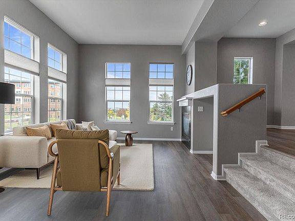 The light-filled gourmet eat-in kitchen features a center island, gleaming LVP floors, and all appliances included. Soaring 12-foot vaulted ceilings and abundant windows invite natural light into every room, complimented by custom blinds and stylish, upgraded light fixtures. Relax by the cozy fireplace or entertain on either of your outdoor living spaces, including a private balcony overlooking lush park views. Your spacious primary suite offers a large walk-in closet with double-vanity sinks. The attached 2-car garage, playroom and additional ground-level storage provide maximum convenience. This vibrant location puts you steps away from Highlands Ranch’s lively Town Center featuring over 20 shops, restaurants like Old Blinking Light and Landsdowne Arms, Starbucks, farmers markets, and seasonal festivals. The HOA covers access to world-class recreation centers, fitness facilities, snow removal, and exterior maintenance – so you can focus on living, not upkeep.