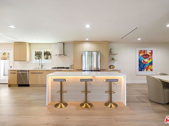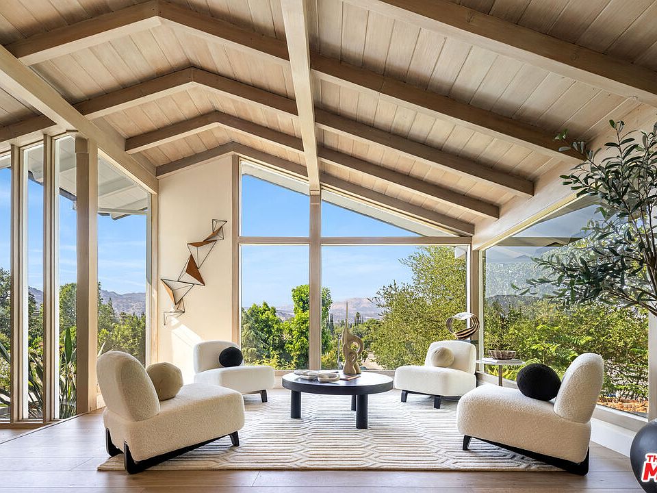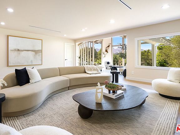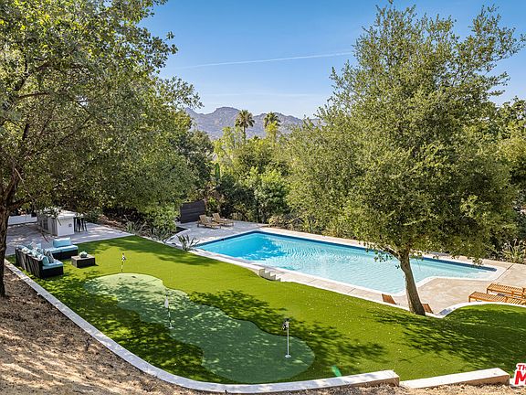 From the moment the automated gates open, The Sky Estate at 9425 Gierson feels less like a residence and more like a private retreat in the clouds. A sculpted drive curves past a detached three-car garage, flanked by mature olive and willow trees, specimen succulents, and native cacti that define the California modern landscape. As you ascend the driveway, the city disappears and the sky opens up. The home's glass-and-IPE-clad faade crowns the ridge, cantilevered above the canyon to capture every sunset. Inside, a vaulted formal living room greets you with 15-foot ceilings and floor-to-ceiling windows framing panoramic mountain and valley views as if the sky were part of the decor. European wide-plank oak floors extend into an open-concept dining area and chef's kitchen, outfitted with Italian cabinetry, a quartz waterfall island, and a full Thermador suite. A patio off the kitchen encourages seamless indoor-outdoor living under open skies. The main level also features a junior en-suite for guests or multigenerational living, a mudroom, powder bath, laundry area, and a lounge/rec room with continued canyon views. Floating Brazilian stairs carry you to two secondary bedrooms and a breathtaking primary suite, where mornings begin with sunrises over the ridgeline. The spa bath includes a freestanding tub, dual rain showers, and custom wardrobe storage.Outdoors, the estate unfolds like a hillside resort, a pool, built-in BBQ, putting green. Steps lead up to a sky-deck and firepit with commanding 270-degree city-light vistas. Engineered for modern luxury with dual-zone HVAC, tankless water heater, 400-amp service, EV charging, and Low-E glazing, The Sky Estate at 9425 Gierson offers a rare sanctuary, ready to welcome the family it was always meant for.