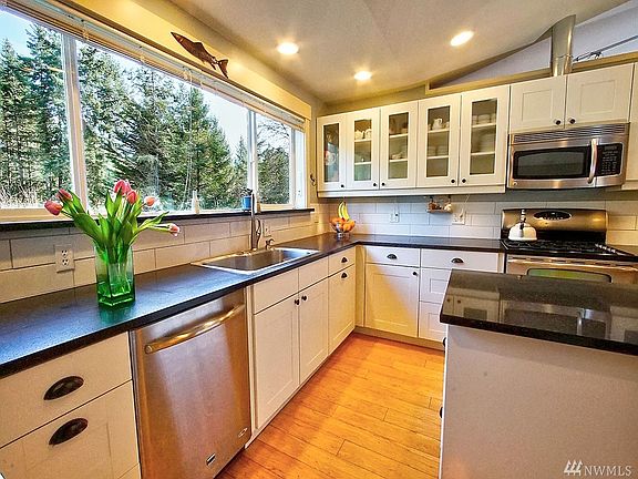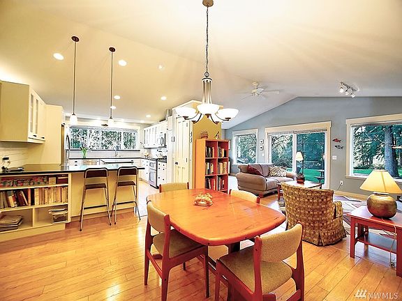 Remodeled one level home on 3 acres. Just across the street from a covered pool, tennis courts, schools and on the bus line. Sandy beach just down the street. The perfect kitchen with quartz counter tops, large island, vaulted ceilings, stainless appliances. Master suite, large family room, hot tub and outdoor living. Forced air natural gas, wood stove, outbuildings. Pet fenced around the house but property runs nearly 1300 ft from road - so great for animals of kinds. Trails thru out.