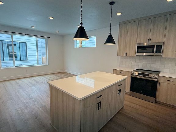 Chef-Inspired Kitchen: Featuring a sleek eat-in island, custom cabinetry, and premium stainless steel appliances perfect for entertaining or everyday meals.