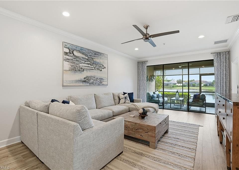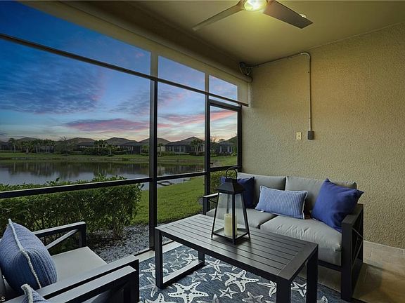 Live the resort lifestyle at Esplanade Golf & Country Club! This immaculate and move-in ready 2 Bedroom + Den, 2 Bath first-floor condo offers an open and airy floor plan with a covered, screened lanai overlooking the lake and southern exposure for beautiful sunsets year-round. Tastefully updated and freshly painted, featuring luxury vinyl flooring in main areas, upgraded carpeting in the primary bedroom, crown molding, custom drapes, white shaker cabinets, quartz countertops, and GE stainless steel appliances including double oven, Includes a detached carport. This property includes a Social/Sports Membership providing access to Esplanade’s resort-style amenities: clubhouse, restaurant, bar, wine-tasting room, cafe, resort pool with cabanas and outdoor Bahama Bar, tennis, pickleball, bocce, Koquina Day Spa, fitness center, dog park, and 14 miles of walking/biking trails. Golf available on a pay-to-play basis. HOA fees cover water, sewer, building insurance, maintenance, and access to all community amenities. Enjoy Naples living at its finest!