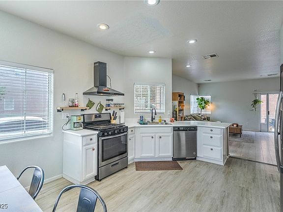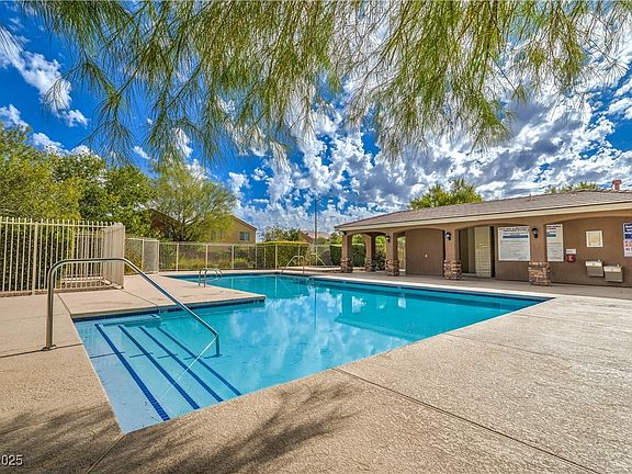 Corner lot home located in the fast-growing Southwest area, offering a modern and open layout. The large downstairs living room and kitchen combo provides plenty of space for entertaining and everyday living. The kitchen features white cabinets, stainless steel appliances, extended countertops with a butcher block section, and a bright breakfast nook. Modern LVP flooring runs throughout the main areas, creating a clean and updated look. Upstairs, the primary bedroom includes a private balcony for relaxing and enjoying the view. Ceiling fans are installed throughout the home for added comfort. The property includes three bedrooms and a functional floor plan designed for convenience and flow. Located in a well-maintained community that offers a pool and spa, this home combines comfort, style, and access to one of the most desirable and rapidly developing areas in Southwest Las Vegas.