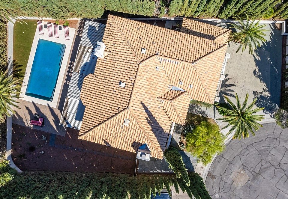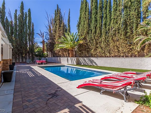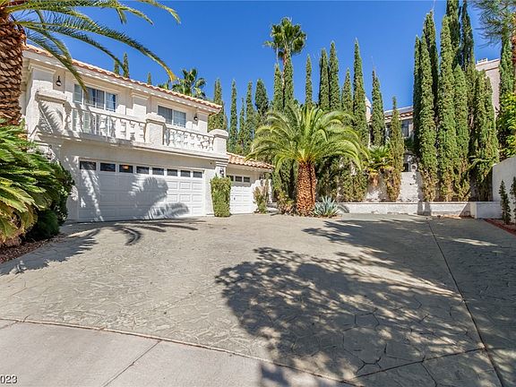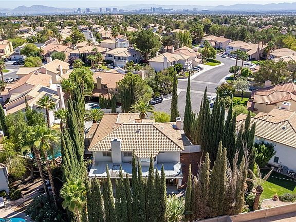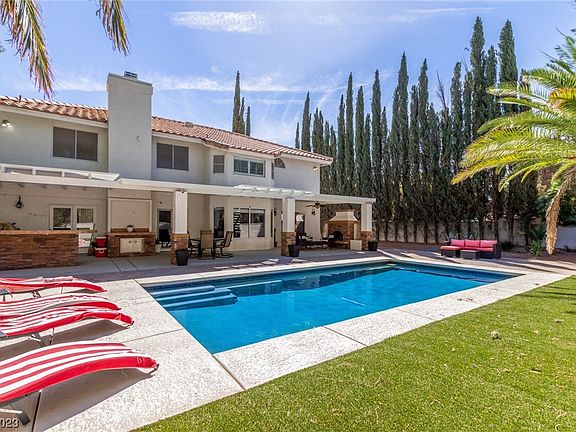 Welcome to this gorgeous residence nestled on a serene cul-de-sac in Las Vegas! A spacious 3-car garage & an RV gate is just the beginning. Discover impressive living areas w/soothing palette, tile flooring, & high ceilings. The ambiance of warmth & comfort is amplified by not 1, but 2 elegant fireplaces that invite you to unwind in their glow! The remarkable chef's kitchen is a culinary haven showcasing cherry wood cabinets adorned w/crown moulding, granite counters, SS appliances, wall oven, recessed lighting, & a pantry ensuring ample storage. Main bedroom features double walk-in closets & a lavish ensuite equipped w/dual sinks & a soaking tub. Plus, a cozy balcony perfect for enjoying fresh air. You'll find a bonus room w/endless possibilities, whether as a media room, extra bedroom, or a creative space! The backyard is an entertainer's dream, comprised of a covered patio, a delightful fireplace, a swimming pool, & a built-in BBQ inviting you to host fun gatherings! Don't miss out!