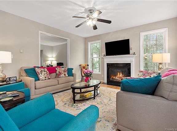 Beautiful 4 BR + Rec room + finished walk out basement! The wonderful floor plan includes a formal dining room with tray ceiling, 1st floor office, family room with fireplace, open kitchen with granite, stainless steel appliances and island and a morning room with access to the deck. The large master suite offers his and her walk-in closets, master bath with double vanities, soaking tub and separate shower. The 3rd floor is a large bonus that could be a great recreation area. The walk-out basement has a theater space, recreation area with a copper penny bar and sink, full bath and a storage area. Hardwood floors throughout the main level, recessed lights, lots of natural light, freshly painted with neutral colors, walk-in pantry and more. Sitting atop a large, well-manicured cul-de-sac lot with a backyard perfect for relaxing or entertaining guests! In addition to the deck, there is a large professionally designed patio area with swings and fire pit. 1-Year 2-10 warranty. This neighborhood has wonderful amenities that include clubhouse, exercise room and swimming pool. The location near I-64 make this a great place to travel easily between the Richmond and Hampton Roads areas.