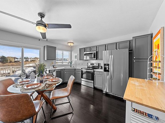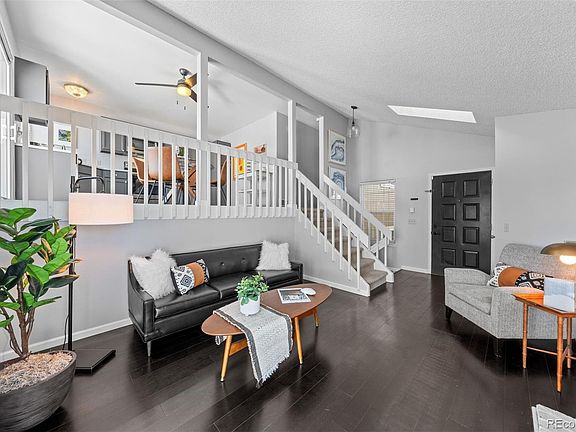 On the main level, a welcoming living room centers around a wood-burning fireplace with a crisp white brick surround, casting warmth and charm as natural light pours in through a skylight above. A glass slider leads to the backyard deck, an ideal space to soak in the wide-open views and Colorado sunsets over the mountains. Just a few steps up, the kitchen offers a bright, open space with stainless steel appliances, ample storage, and room for a dining table. Another slider here opens onto the upper deck and washes the kitchen in natural light.