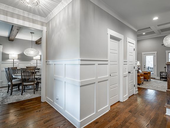 WELCOME HOME to this lovely custom home. Enter the beautiful double front doors and be greeted by a spacious entrance showcasing custom millwork and ceilings with custom lighting. The great room features specialty ceilings, beautiful lighting, custom millwork, a gas-burning fireplace, and built-in bookshelves. The gorgeous open concept kitchen is an entertainer's dream offering upgraded appliances to include Kitchen Aid 5-burner Gas Cooktop, custom vent hood, Kitchen Aid Wall Oven/Microwave, Jenn-Air Dishwasher. There's plenty of counter space on these gorgeous quartz countertops, undermount lighting, and huge farmhouse sink, and the oversized island which also provides plenty of storage. Off the kitchen is the dining room, featuring a wood beam ceiling, custom lighting and custom millwork. Off the foyer is the powder room designer wallpaper. The main level features gleaming hardwood floors and stairs. There are custom blinds throughout part of the home.