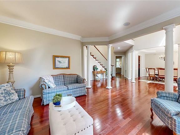 Welcome home to this exceptional 6,100+ sq ft home in the sought-after Stonehouse Glen community. This residence blends timeless craftsmanship with modern updates, featuring cherry hardwood floors, soaring ceilings, a dramatic two-story stone fireplace, and expansive windows. The chef’s kitchen boasts 42” cabinets, pull out cabinet drawers, a 14-ft island with seating and prep sink, granite counters, double ovens, and gas cooktop. A first-floor guest suite, tray-ceiling formal dining room, and sunlit morning room enhance the main level. Upstairs, the luxurious primary retreat offers a vaulted sitting area, spacious bathroom with garden tub, and new custom shower. The fully finished basement provides a kitchenette, bar seating, rec room, bedroom, and full bath—ideal for guests or private multi-generational living. Outside, enjoy tiered decks, a paver patio, butterfly garden, and wooded privacy. Stonehouse Glen offers resort-style amenities including golf, pools, tennis, and clubhouse.