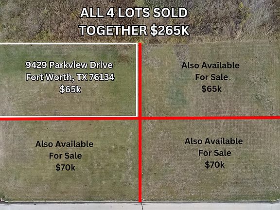 Investor-Developer Opportunity in Crowley, TX! Located at 9433 Parkview Drive, this prime lot is being sold together with 3 adjoining lots for a total package price of $265,000. Offering ample space and frontage, this combined property is ideal for residential development, a builder's project, or a long-term investment. Buyer to verify zoning and usage. Situated in a growing area with easy access to major roads and local amenities, the possibilities are wide open. Don’t miss your chance to secure four contiguous lots