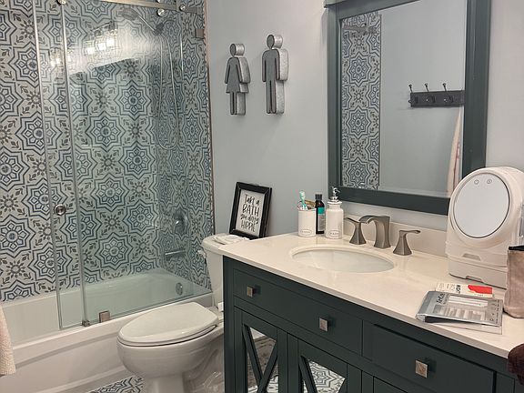 Step outside to your private resort-style backyard featuring a heated and chilled pool, retractable awning for shade, outdoor bar with refrigerator, Sonos sound system, and mounted TV perfect for entertaining. The beautifully landscaped yard includes a putting green for golf enthusiasts and plenty of space to relax or host gatherings.