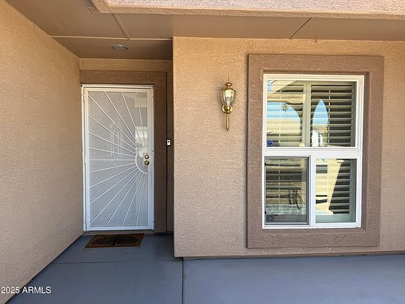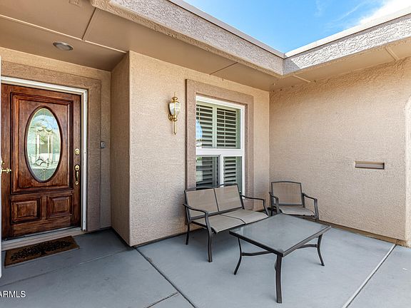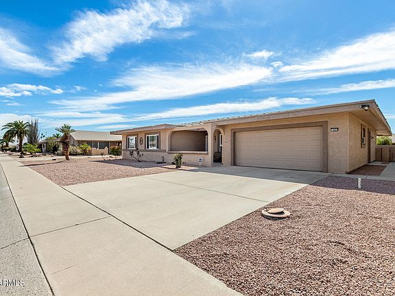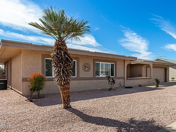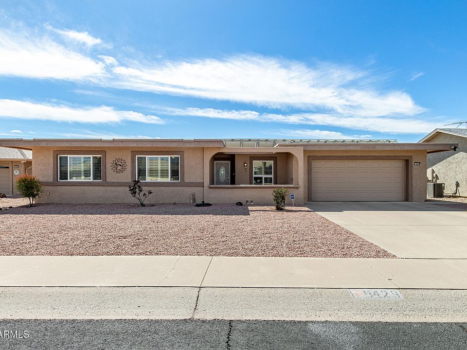 Must see! Large 3 bedroom, 2 bathroom house with plantation shutters and solar panels located in Sun City. Open living and dining room ideal for gathering family and friends. Roomy master bedroom with a make-up vanity, walk-in closet and private bathroom. Backyard with large covered patio and shed. Two car garage with insulated garage door, overhead storage racks and work bench. **Recently updated roof in 2024 as well as interior paint, tile flooring, baseboards, quartz kitchen countertop, master shower and toilets in both bathrooms in 2022.** A/C in the garage has never been used and the solar water heater was disconnected. Washer and dryer do not convey. Buyer to verify all pertinent facts and figures.