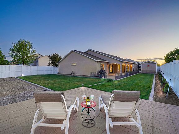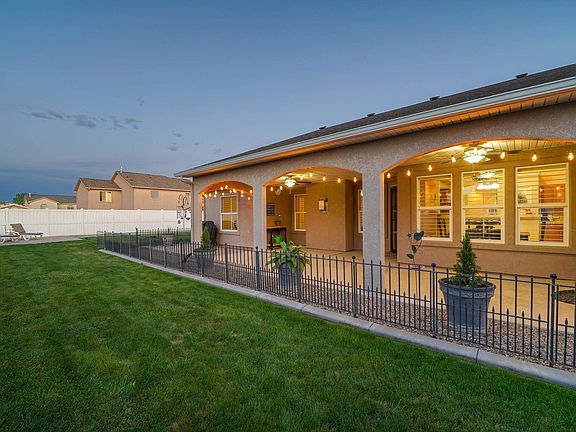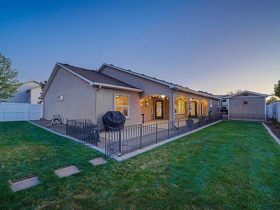 Welcome to this stunning ranch-style home featuring a desirable split-bedroom floor plan, offering 3 spacious bedrooms, 2 full bathrooms, 2 half bathrooms, and an office with french doors for privacy. Step inside to an open-concept layout perfect for entertaining with a formal dining room and inviting living area highlighted by a vaulted ceiling and a beautifully tiled gas fireplace, perfect for cozy evenings. Featuring stylish barn wood and ceramic tile flooring throughout, a bright, spacious kitchen with high ceilings, brand new stainless steel appliances, ample counter space, and pantry. The energy-efficient plantation shutters and the freshly painted interior offer warmth and comfort throughout. You'll love the expansive primary suite, complete with a tray ceiling, french doors leading to the patio, and a luxurious 5-piece en-suite bathroom with a soaker tub, linen closet, and a large double walk-in closet with separate spaces and custom shelving. Enjoy Colorado’s beautiful seasons on the expansive 15'x28' covered back patio with ceiling fans, additional paved areas, and a massive lot perfect for outdoor entertaining. An oversized 3+ car garage is the perfect space for all your vehicles, toys, and hobbies, complete with storage cabinets, drawers, and a stainless steel utility sink. There is also a 16'x10' storage shed providing extra room for tools or gear and a gated 18'x72' cement RV pad which includes a 50-amp hookup and drainage grate—ideal for RV enthusiasts. Don’t miss the gated front courtyard, where you can relax and enjoy breathtaking views of the Colorado National Monument.