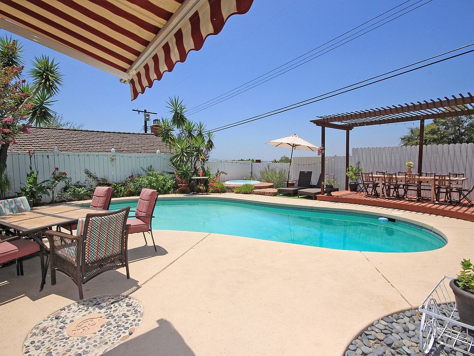 Updated and expanded Burbank, pool home with four bedrooms and 2 bathrooms. Formal living room with stone fireplace, gorgeous gourmet kitchen with custom cabinetry, granite counter tops, chef's island and top of the line appliances. Formal Dining area with plantation shutters, comfortable great room with 2nd fireplace and convenient inside laundry room. The master suite is beautiful with great closet space and access to new deck and yard. Backyard is private and fully fenced with fun pool, spa and new trex deck. Excellent hillside location!