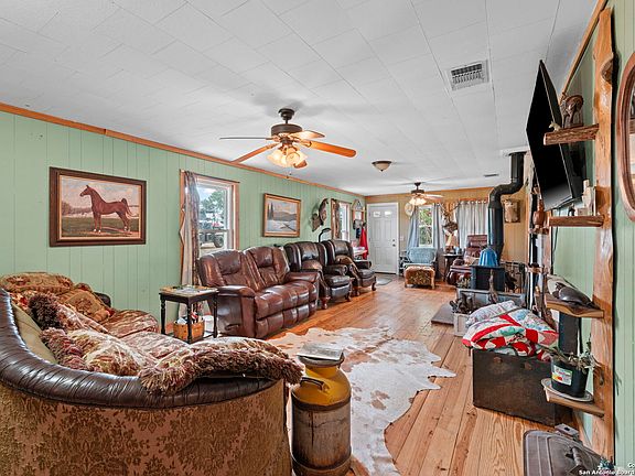 Welcome home to 943 Stoneleigh Road in Center Point, Texas-your own piece of Hill Country heaven. Imagine waking up to the sun cresting over almost 16 unrestricted acres of rolling Texas landscape, with two serene ponds nestled among mature oak trees. Inside the main three-bedroom, two-bath home, you'll find the warmth of hardwood floors and the peace of mind that comes with a solid metal roof. The living room's wood-burning stove invites cozy winter evenings, while the covered back porch is perfect for sipping coffee on your rocking chairs as you watch the world wake up. Step out onto the patio and take in the sweeping views of your private mini-orchard bursting with plum, peach, and apricot trees. Entertain in style with a dedicated outdoor grill and dining area, and don't forget the luxurious hot tub for starlit soaks. Guests will feel right at home in the charming mother-in-law suite, complete with a kitchenette and full bath. With your own private water well, two large storage tanks, and a fully insulated pump house, you have everything you need for self-sufficient country living. With abundant wildlife, hunting opportunities, and breathtaking sunsets and sunrises, this property is the perfect blend of rustic charm and modern comfort. It's not just a home-it's the dream you've been waiting for. Come see why this is the country oasis where your heart belongs.